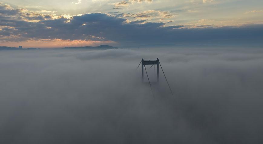 Fatih Sultan Mehmet Köprüsü yoğun sis nedeniyle beyaz örtünün altında kalırken, sadece köprü ayaklarının üst kısımları görülebildi.